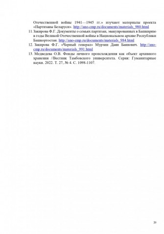 13. Медведева О.В. Фонды личного происхождения как объект архивного хранения //Вестник Тамбовского университета. Серия: Гуманитарные науки. 2022. Т. 27, № 4. С. 1098-1107.