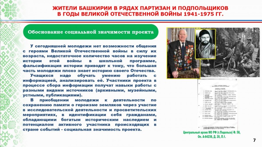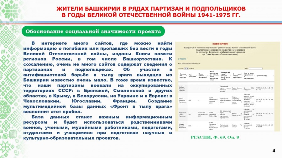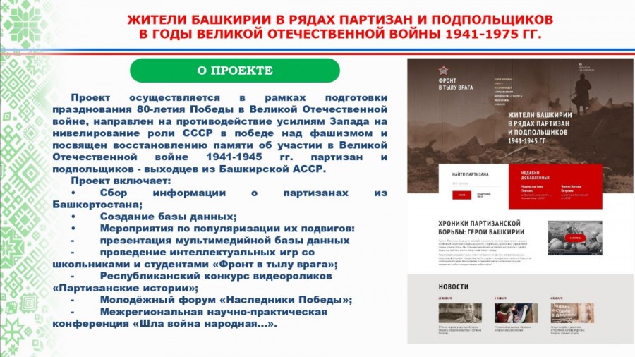 Презентация Историко-просветительского проекта «Жители Башкирии в рядах партизан и подпольщиков в годы Великой Отечественной войны 1941–1945 гг.»