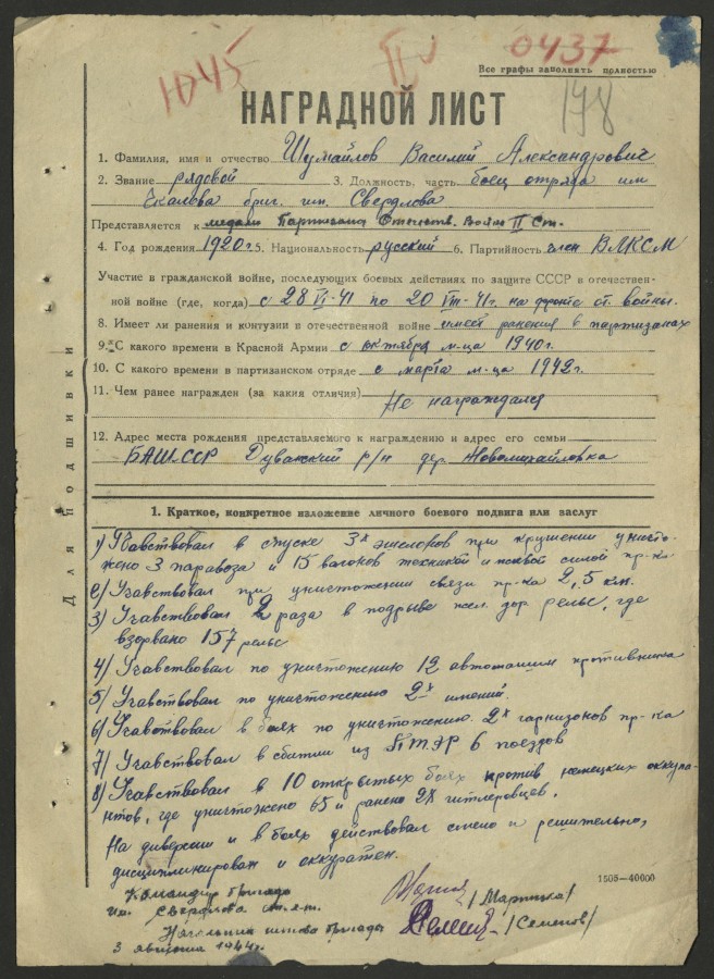 Фронтовая судьба уроженца деревни Новомихайловка Дуванского района Василия Александровича Шумайлова удивительным образом связана с городом Брестом. 22 июня 1941 года в Брестской крепости он принял первый бой, два с половиной года воевал в одном из партизанских отрядов Брестского соединения, в августе 1944 года Брестским ГВК направлен в действующую армию.