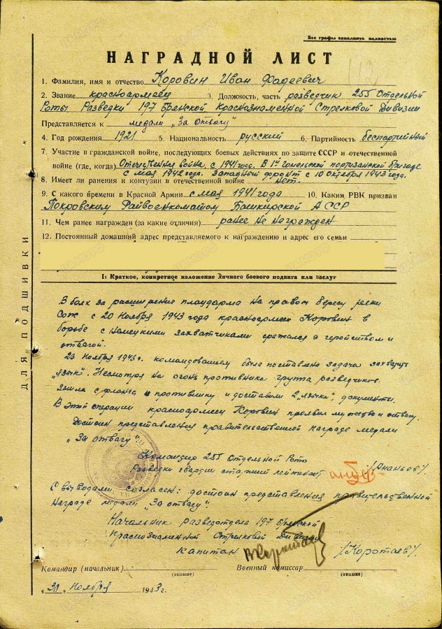 Коровин Иван Фадеевич (1921 г.р., д. с. Бедеева Поляна Покровского района) сражался в отряде им. Калинина 1-я Гомельской партизанской бригады с мая 1942 года. В ноябре 1943 года, уже после соединения с Красной армией, он проявил исключительное мужество в разведке. Под огнём противника группа, в которой он был, захватила двух «языков» с ценными документами. За этот бой он был представлен к медали «За отвагу», а ранее был награждён медалью «За боевые заслуги».