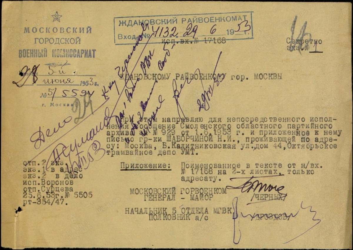В мае 1953 г. родная сестра Зины Наталья Ивановна Шабарчина писала в Смоленский обком КПСС с просьбой уточнить судьбу младшей сестры — связь оборвалась ещё в январе 1942-го. Смоленский областной партийный архив в июне 1953 г. отправил в адрес Московского облисполкома письмо, где сообщалось, что по неофициальным данным учетной карточки, не подписанной командованием, в архиве есть сведения о Шаборшиной Зинаиде, которая 26 августа 1942 г. убита в разведке около деревни Старое Лавшино Жуковского района. Похоронена там же. Первым о Зинаиде написал известный краевед из Калтасинского района Роберт Шакиртов (Газета “Калтасинская Заря” № 104 от 30 декабря 2021 г.).