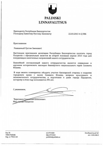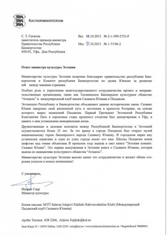 В октябре 2015 года Заместителем Премьер-министра Правительства Республики Башкортостан С.Т.Сагитовым было направлено письмо в адрес Министерства культуры Эстонской Республики относительно дальнейшего развития двустороннего сотрудничества между Башкортостаном и Эстонией и, в частности по вопросу обновления экспозиции общественного музея Салавата Юлаева в г.Палдиски Эстонской Республики. В ответ на донное обращение в адрес Правительства Республики Башкортостан поступил положительный ответ за подписью Министра культуры Эстонской Республики г-на Индрека Саара.