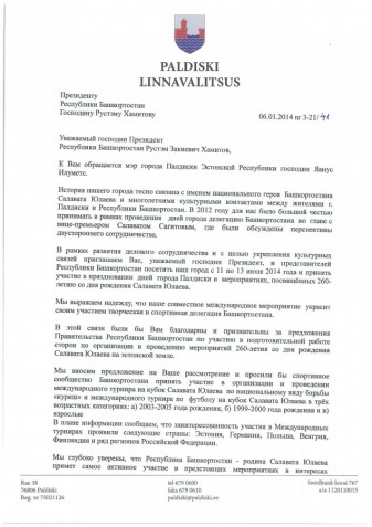 В январе 2014 года мэр г.Палдиски Эстонской Республики Яанус Илуметс направил приглашение Президенту Республики Башкортостан Р.З.Хамитову с предложением посетить г.Палдиски с 11 по 13 июля 2014 года и принять участие в праздновании Дней города Палдиски и мероприятиях, посвященных 260-летию со дня рождения Салавата Юлаева. В рамках празднования Яанус Илуметс предложил организовать и провести в г.Палдиски международный турнир на кубок Салавата Юлаева по национальному виду борьбы «куреш» и международный турнир по футболу на кубок Салавата Юлаева. Мэр проинформировал, что заинтересованность в проведении международных турниров проявили Эстония, Германия, Польша, Венгрия, Финляндия и ряд регионов России.
