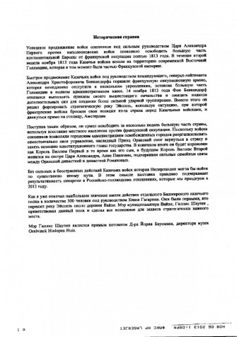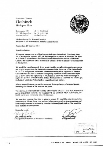 Приглашение Главы Республики Башкортостан на открытие выставки, посвященной 200-летию освобождения Нидерландов русскими войсками от наполеоновского господства «1813 год: Голландия, освобожденная русскими», организованной Генеральным директором Музея Гелвинк в Амстердаме Юрном Буйсманом в рамках перекрестного года Россия – Нидерланды, посвященного 400-летию установления культурных связей между Россией и Нидерландами.