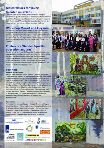 В рамках проекта Государственный академический русский драматический театр Республики Башкортостан и голландский ансамбль «Гексагон» представили совместную программу - музыкально-драматическую композицию «Желтое солнце Ван Гога», посвященную великому художнику. Были организованы выставки работ молодых художников Уфимской государственной академии искусств им. Загира Исмагилова, Республиканской художественной гимназии-интерната им. К.А. Давлеткильдеева.