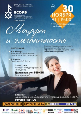 В Государственном концертном зале «Башкортостан» прошел концерт «Моцарт и Элегантность» пианистки Дарьи ванн ден Беркен совместно с Национальным симфоническим оркестром РБ.