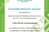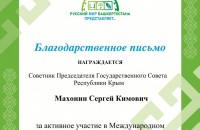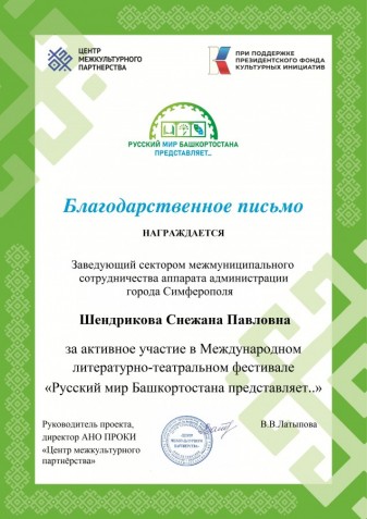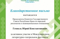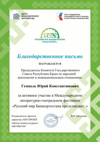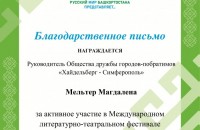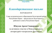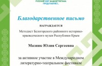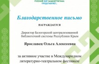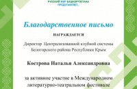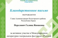В рамках фестиваля состоялась церемония награждения победителей международного конкурса детских рисунков «Подарок Внучке Оленьке – сказка Аленький цветочек» мотивам сказки С.Т.Аксакова и «Своей семье я говорю: «Спасибо!», в каждом из которых приняло участие более 1000 детей из регионов России и зарубежных стран. Руководитель АНО ПРОКИ «Центр межкультурного партнерства» Валентина Латыпова и заместитель главы администрации Белогорского района Ленара Джелялова поздравили победителей конкурсов из Республики Крым, вручили им подарки и дипломы.