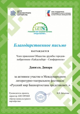 Вниманию жителей г.Симферополя и г.Белогорска в рамках фестиваля были представлены выставки «Башкирия в русской литературе: от Пушкина и Аксакова, Чехова и Толстого до Цветаевой и Довлатова», повествующая о вкладе русских писателей в изучение и презентацию общественности России Башкирского края и «Семья и семейные ценности Аксаковых», рассказывающая о деятельности и творчестве представителей аксаковской семьи, об аксаковских местах в России и за рубежом. Выставки способствовали продвижению русской культуры в мире, повышению интереса широкого круга общественности России и Германии к русской классической литературе.
