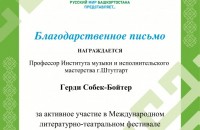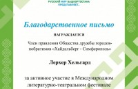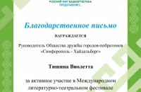 Живой интерес присутствующих вызвала презентация выставок «Русские писатели и художники в Крыму» и «Чехов и Германия», сделанная Хельгард Лерхер (Германия). А.П. Чехова любят в Германии, на театральных сценах часто проходят спектакли по его произведениям: «Чайка», «Дядя Ваня», «Три сестры», «Вишневый сад», создано немецкое общество Чехова, открыт музей "Чеховский салон" в Баденвайлере. В г.Гейдельберг работает любительский театр «Давай! Давай! Театр!», ставящий спектакли по произведениям А.П. Чехова на немецком языке. Об этом на фестивале в мае этого года в Уфе рассказали актеры этого театра в рамках круглого стола «Мир русского театра».