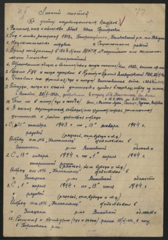 Как видим, на двух листах содержится фактически формулярный список партизана – сведения о дате и месте рождения, образовании, партийности, месте призыва и боях, в которых он участвовал. Когда и при каких обстоятельствах попал в плен, в каком подразделении партизанского движения участвовал, когда и где, в каком звании, был ли ранен, состав семьи. И главный документ – боевая характеристика партизана.