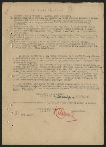 Представлен к награде Медаль «Партизану Отечественной войны» II-й степени;