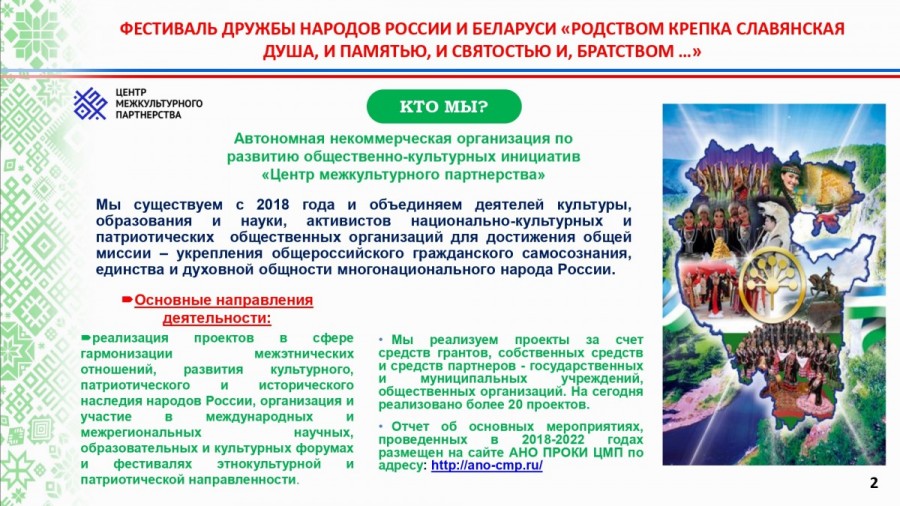 Автономная некоммерческая организация по развитию общественно-культурных инициатив «Центр межкультурного партнёрства» совместно с Региональной общественной организацией «Белорусов Башкортостана» по сохранению и развитию культуры и традиций белорусского народа принимают участие в конкурсе Президентского фонда культурных инициатив на получение гранта на реализацию проекта «Фестиваль дружбы народов России и Беларуси «Родством крепка славянская душа, и памятью, и святостью, и братством...».