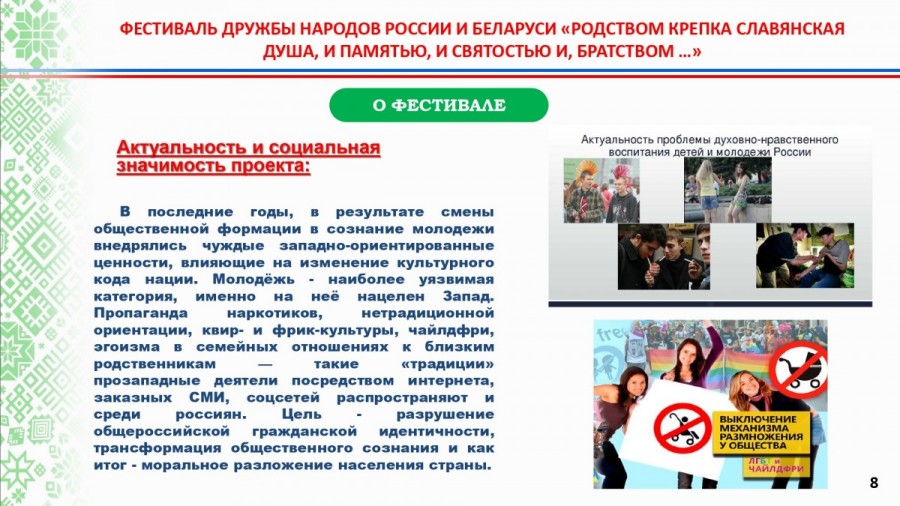 Проект предполагает формирование у молодежи интереса к традиционной культуре и потребности в сохранении историко-культурного наследия славянских народов в противовес феномену «культуры отмены», насаждающемуся Западом.