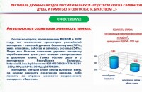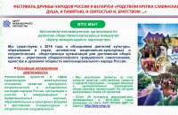 Фестиваль дружбы народов России и Беларуси «Родством крепка славянская душа, и памятью, и святостью, и братством...» является логическим продолжением Международного молодежного культурно-образовательного этнофорума «Славянский хоровод».