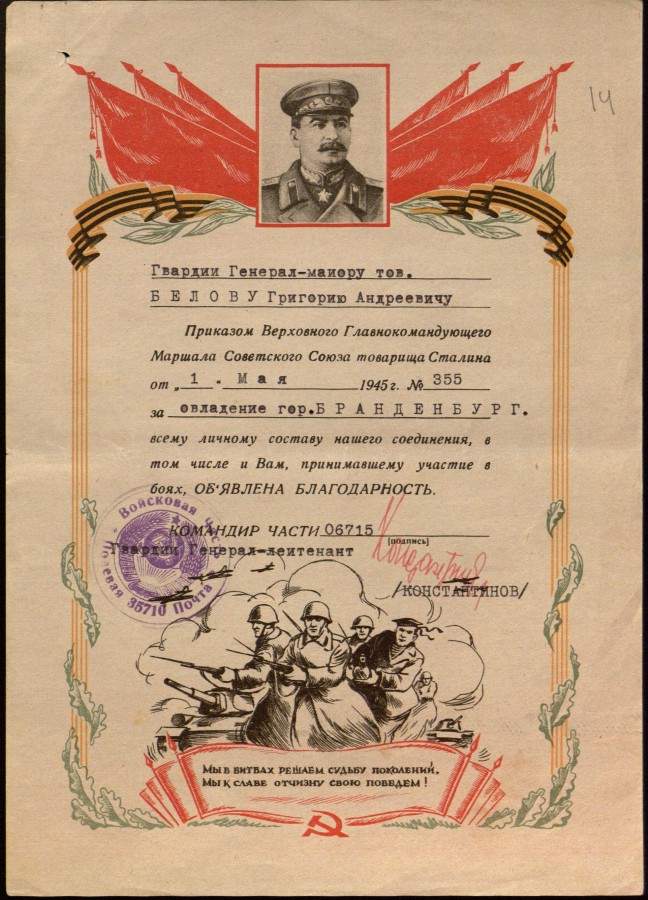 Приложение: Сканкопии письма Государственного архива Ульяновской области и документов из личного фонда Григория Андреевича Белова - Героя Советского Союза, командира 16-й гвардейской Черниговской кавалерийской дивизии.