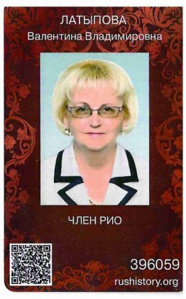 Билет РИО получила и директор Автономной некоммерческой организации по развитию общественно-культурных инициатив «Центр межкультурного партнёрства» Валентина Латыпова. АНО по развитию общественно-культурных инициатив «Центр межкультурного партнёрства» многие годы плодотворно сотрудничает с Российским историческим обществом. В частности, при участии РИО в Республике Башкортостан реализованы проекты «Культурно-исторический фестиваль «Интернациональная Победа», посвящённый 75-летию победы в Великой Отечественной войне, «Историко-мемориальная экспедиция «По следам мужества и славы: эстафета поколений», посвящённая 80-летию освобождения Донбасса от немецко-фашистских захватчиков в годы Великой Отечественной войны.