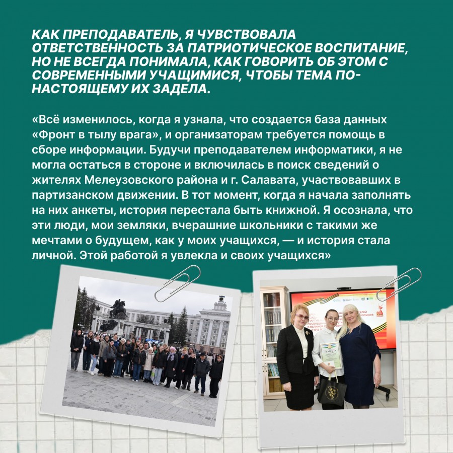Сегодня в нашей рубрике преподаватель информатики Ольга Пищаева. Она честно рассказывает о том, как проект «Историко-просветительский проект: Жители Башкирии в рядах партизан и подпольщиков в годы Великой Отечественной войны» помог ей и студентам её группы понять, что история ближе, чем кажется.