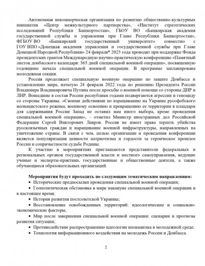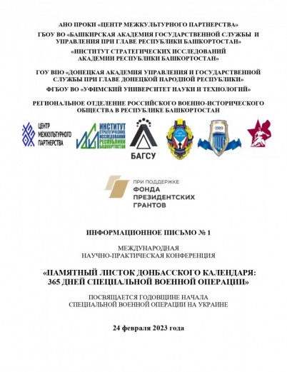 Автономная некоммерческая организация по развитию общественно-культурных инициатив «Центр межкультурного партнерства», «Институт стратегических исследований Республики Башкортостан», ГБОУ ВО «Башкирская академия государственной службы и управления при Главе Республики Башкортостан», ФГБОУ ВО «Башкирский государственный университет» совместно c ГОУ ВПО «Донецкая академия управления и государственной службы при Главе Донецкой Народной Республики» 24 февраля* 2023 года проводят при поддержке Фонда президентских грантов Международную научно-практическую конференцию «Памятный листок донбасского календаря: 365 дней специальной военной операции», посвященную годовщине начала специальной военной операции. В программе запланирована молодежная секция.