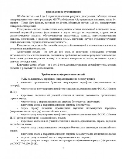 Объём статьи – от 4 до 8 страниц (включая рисунки, диаграммы, таблицы, список литературы) в текстовом редакторе MS Word (формат А4; ориентация книжная; кегль 14; шрифт – Times New Roman, все поля по 20 мм, абзацный отступ 1,25 см, межстрочный интервал одинарный).