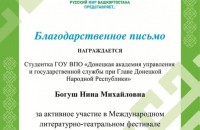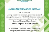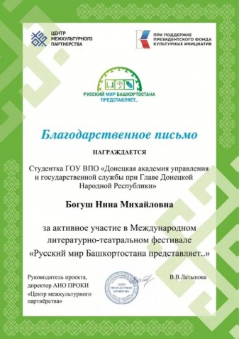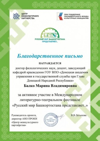 Донецкая академия управления и государственной службы при Главе ДНР выразила благодарность АНО ПРОКИ «Центр межкультурного партнёрства» за возможность участия в фестивале «Русский мир Башкортостана представляет…»