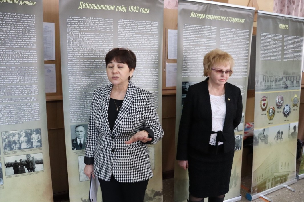 Руководитель Музея 112-й Башкирской (16-й гвардейской) кавалерийской дивизии Фарида Юсупова презентовала передвижную выставку «7-й гвардейский кавалерийский корпус в Дебальцевском рейде. Путь мужества и славы», посвященную 80-летию начала освобождения Донбасса от немецко-фашистских захватчиков и годовщине гибели Героя России генерал-майора Минигали Шаймуратова. Выставка рассказывает об истории формирования и боевом пути 8-го (7-го гвардейского) кавалерийского корпуса и 112-й Башкирской (16-й гвардейской) кавалерийской дивизии, о героическом Дебальцевском рейде по тылам противника в 1943 году, о послевоенной истории кавалерийского корпуса и его дивизий, о том, как благодарные потомки в Башкортостане свято хранят и чтут память о воинах-кавалеристах.