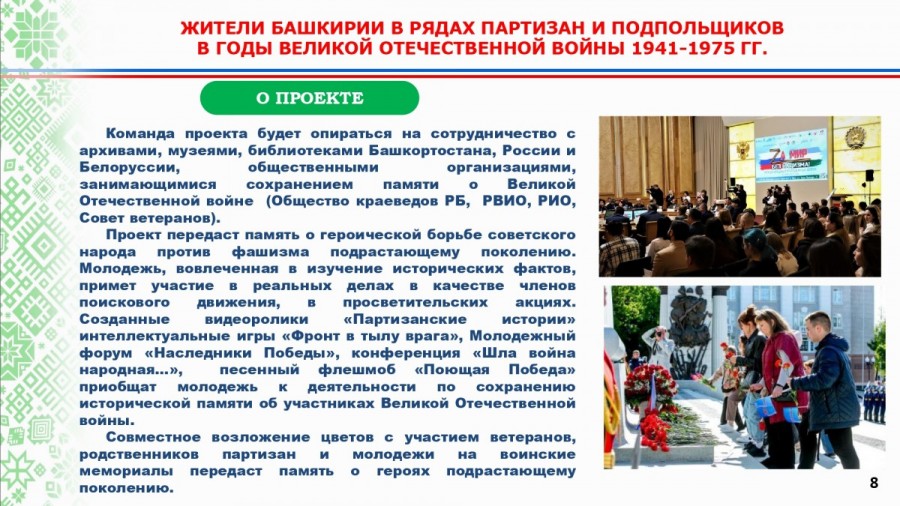 Историко-просветительский проект «Жители Башкирии в рядах партизан и подпольщиков в годы Великой Отечественной войны 1941-1945 гг.» стал победителем в первом конкурсе на предоставление грантов Главы Республики Башкортостан
