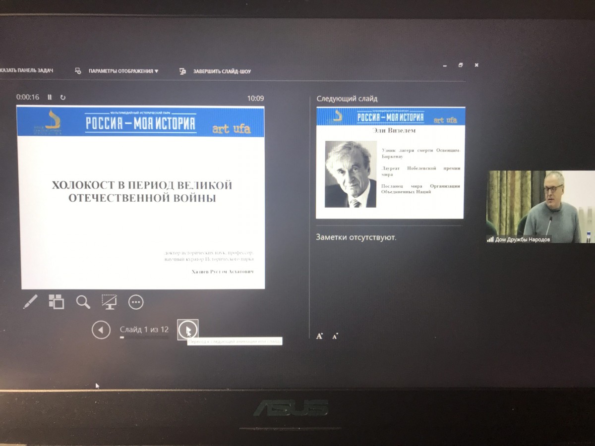 Научный куратор уфимского уфимского Исторического парка «Россия – Моя История», доктор исторических наук, профессор Башкирского государственного университета Рустем Хазиев сделал доклад о холокосте в период Великой Отечественной войны. Он подчеркнул, что холокост являлся государственной политикой нацистской Германии с 1933 г.