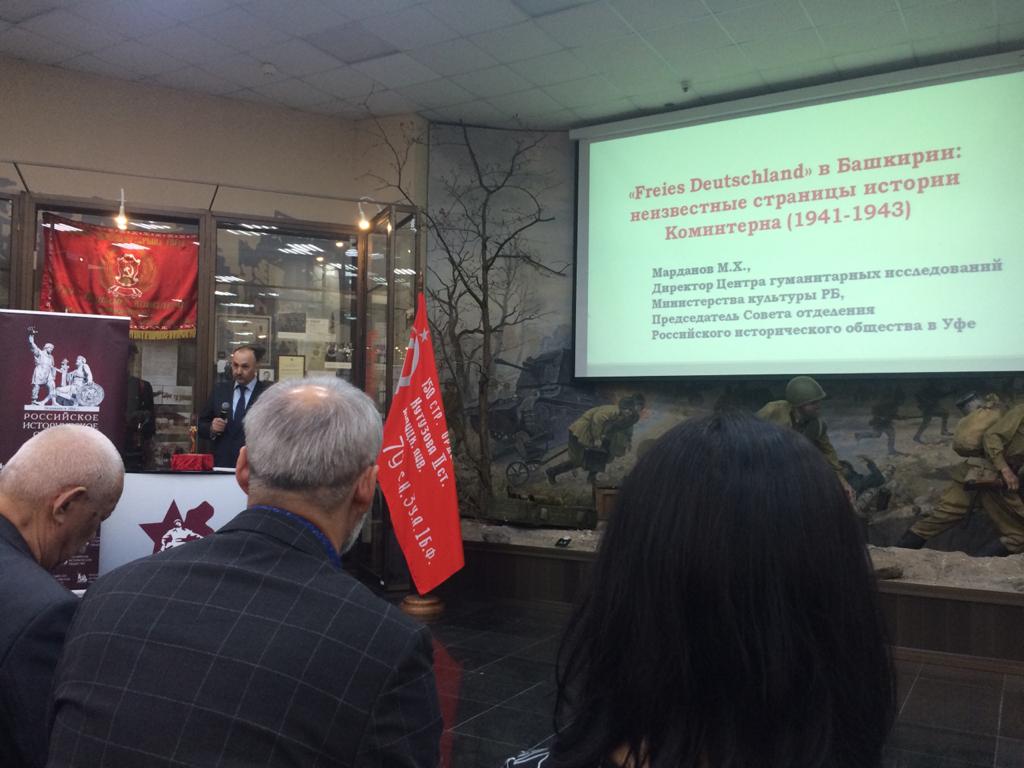 С информацией о новых ранее неизвестных широкой аудитории страницах истории Коминтерна 1941-1943 годов, в частности о представителях немецкого народа, выступил кандидат политических наук, член-корреспондент Академии военных наук, полковник в запасе, директор Центра гуманитарных исследований Министерства культуры Республики Башкортостан, председатель Совета Отделения Российского исторического общества в Уфе Марданов Марат Хамитьянович.