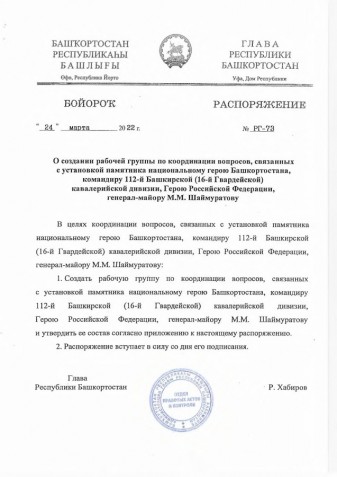 Директор АНО ПРОКИ «Центр межкультурного партнерства» Валентина Латыпова распоряжением Главы Республики Башкортостан Р.Хабирова № РГ-73 от 24 марта 2022 года включена в состав рабочей группы по координации вопросов, связанных с установкой памятника национальному герою Башкортостана, командиру 112-й Башкирской (16-й Гвардейской) кавалерийской дивизии, Герою Российской Федерации, генерал-майору М.М.Шаймуратову.