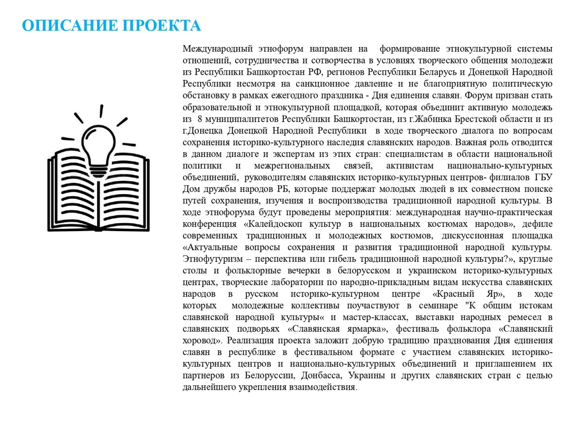 Интерес к теме обусловлен ее актуальностью и стремлением воспитывать подрастающее поколение на народных традициях, возродить и адаптировать к потребностям молодежи интерес к народной культуре. Реализация проекта заложит добрую традицию празднования Дня единения славян в Республике Башкортостан в фестивальном формате с участием славянских историко-культурных центров и национально-культурных объединений и приглашением их партнеров из Белоруссии, Донбасса, Украины и других славянских стран с целью дальнейшего углубления взаимодействия. Праздник станет брендовым мероприятием славянских историко-культурных центров в целях развития этнотуризма в Республике Башкортостан. Этнофорум расширит гуманитарное сотрудничество между гражданскими обществами России, Белоруссии и Донецкой Народной Республики и будет содействовать популяризации межнационального и межконфессионального мира и согласия в молодежной среде.