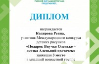 Победители международных конкурсов рисунков «Подарок внучке Оленьке – сказка «Аленький цветочек» по мотивам сказки С.Т. Аксакова и «Своей семье я говорю: «Спасибо!» из Республики Крым награждены дипломами и ценными подарками
