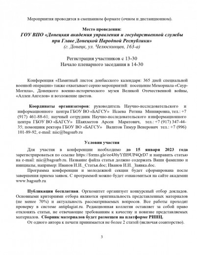 Автономная некоммерческая организация по развитию общественно-культурных инициатив «Центр межкультурного партнерства», «Институт стратегических исследований Республики Башкортостан», ГБОУ ВО «Башкирская академия государственной службы и управления при Главе Республики Башкортостан», ФГБОУ ВО «Башкирский государственный университет» совместно c ГОУ ВПО «Донецкая академия управления и государственной службы при Главе Донецкой Народной Республики» 24 февраля* 2023 года проводят при поддержке Фонда президентских грантов Международную научно-практическую конференцию «Памятный листок донбасского календаря: 365 дней специальной военной операции», посвященную годовщине начала специальной военной операции. В программе запланирована молодежная секция.