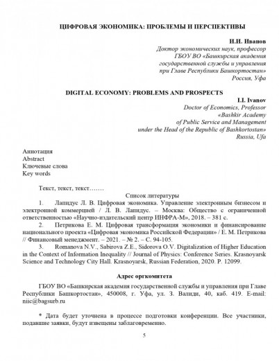Для участия в конференции необходимо до 15 января 2023 года зарегистрироваться по ссылке https://forms.gle/ee4J6yYfH9UP4QrD7 и направить статью на e-mail: niic@bagsurb.ru. Название файла статьи должно содержать Ваши фамилию и инициалы, например: Иванов И.И._Статья.doc; Иванов И.И._Заявка.doc.