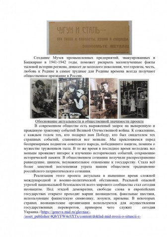 - увековечение трудовой доблести наших бабушек и дедушек через создание музея актуально и сегодня - в условиях проведения Специальной военной операции. Ее успех напрямую связан с трудом всего сплоченного российского народа. У сегодняшних современников есть достойный пример для повторения трудового подвига тружеников тыла. Сейчас так же, как и в былые времена, мы должны стать надежным тылом, который сможет дать нашей армии все необходимое и возможное. Параллели между событиями минувших лет и сегодняшним днем очевидны: жители республики, несмотря на тяготы военного времени и голод, трудились не покладая рук, производя двигатели, боеприпасы, топливо, обмундирование. Республика радушно принимала у себя эвакуируемых взрослых и детей, обеспечивала лечение тысячам раненых, готовила резервы для армии и флота. Сейчас Башкортостан, как и вся Россия, так же помогает нашим защитникам на новых рубежах нашей страны и радушно принимает беженцев и эвакуируемых из прифронтовых территорий. Федерация профсоюзов РБ с первых дней принимает участие в поддержке мобилизованных из нашей республики. В целях координации и централизации оказания гуманитарной помощи от профсоюзов объявлена Акция: «Профсоюзы своих не бросают!»// http://www.fprb.ru/news/?ELEMENT_ID=29855;