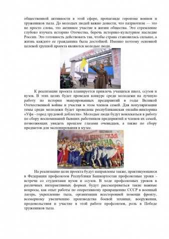 На протяжении реализации проекта будет проводиться научно-просветительская и патриотическая работа по пропаганде трудового подвига жителей Башкортостана в годы войны среди молодежи и в СМИ, сети «Интернет».