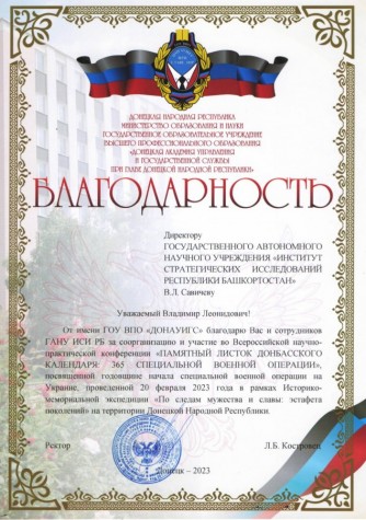 Организаторы Всероссийской научно-практической конференции «Памятный листок Донбасского календаря: 365 дней специальной военной операции» получили благодарности от Донецкой академии управления и государственной службы при Главе Донецкой Народной Республики