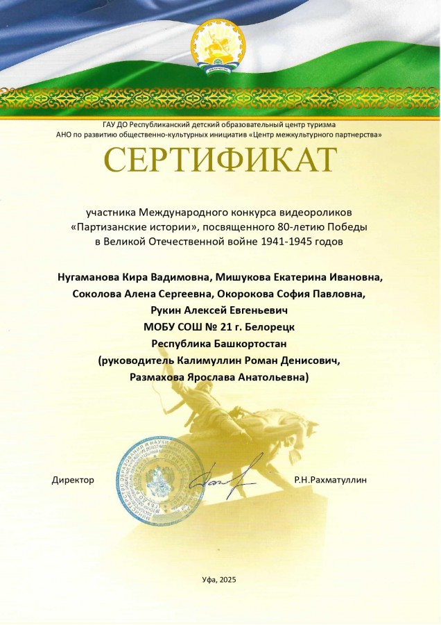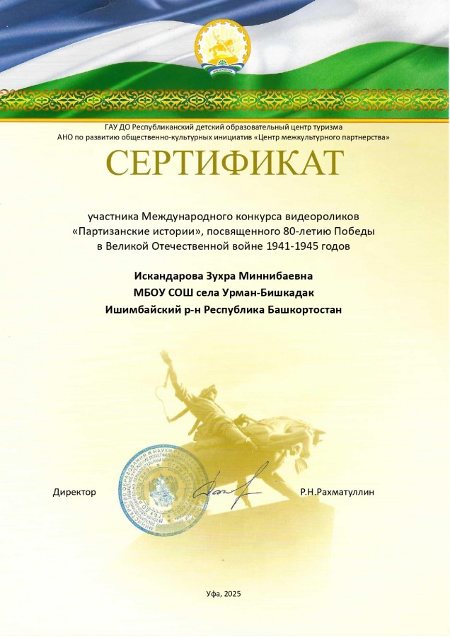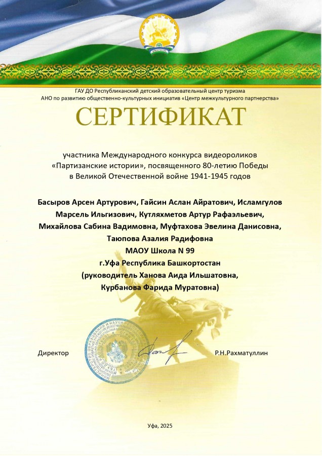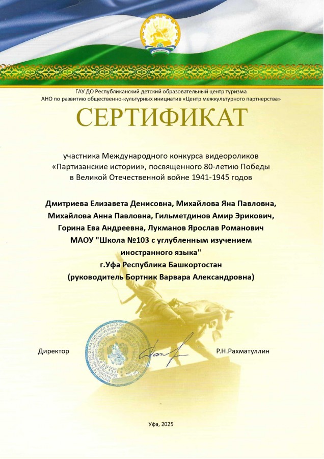 С 20 ноября 2024 года по 10 февраля 2025 года Республиканский детский образовательный центр туризма провёл Международный конкурс видеороликов «Партизанские истории», посвящённый 80-летию Победы в Великой Отечественной войне. Мероприятие прошло в рамках историко-просветительского проекта «Жители Башкирии в рядах партизан и подпольщиков в годы Великой Отечественной войны 1941–1945 гг.», разработанного АНО «Центр межкультурного партнёрства» при поддержке Фонда Главы Республики Башкортостан.