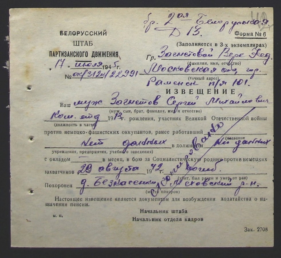 Официальное извещение о гибели было направлено жене 17 июля 1945 года Белорусским штабом партизанского движения. Похоронен в д. Бесносенки Меховского р-на Витебской области Республика Беларусь