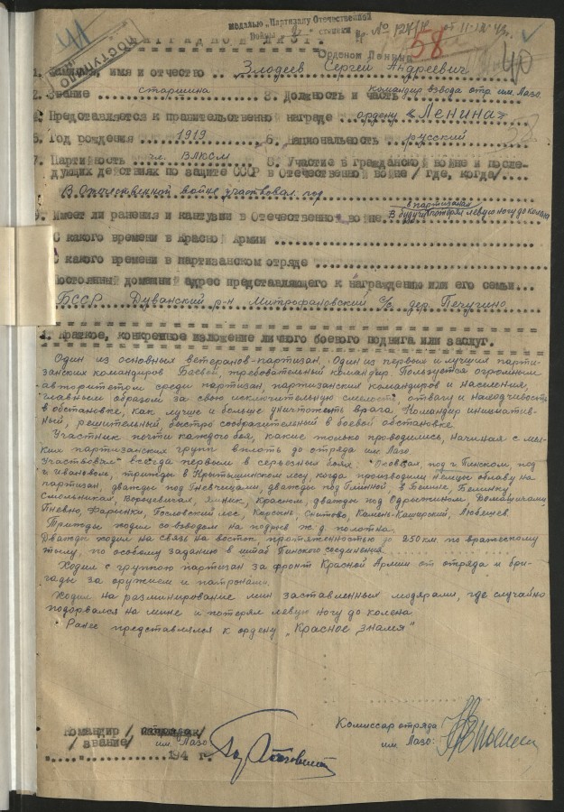 «Злодеев Сергей Андреевич, год рождения 1919, член ВЛКСМ, образование 7 классов. В партизанском отряде имени Лазо с 1942 года июня месяца. До организации партизанских отрядов находился в мелких партизанских группах.