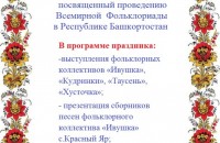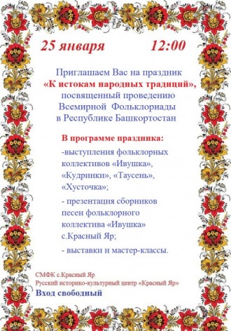 25 января 2020 года в Русском историко-культурном центре в Сельском многофункциональном клубе села Красный Яр Уфимского района Республики Башкортостан состоится праздник «К истокам народных традиций, посвященный «Всемирной Фольклориаде – 2020».
