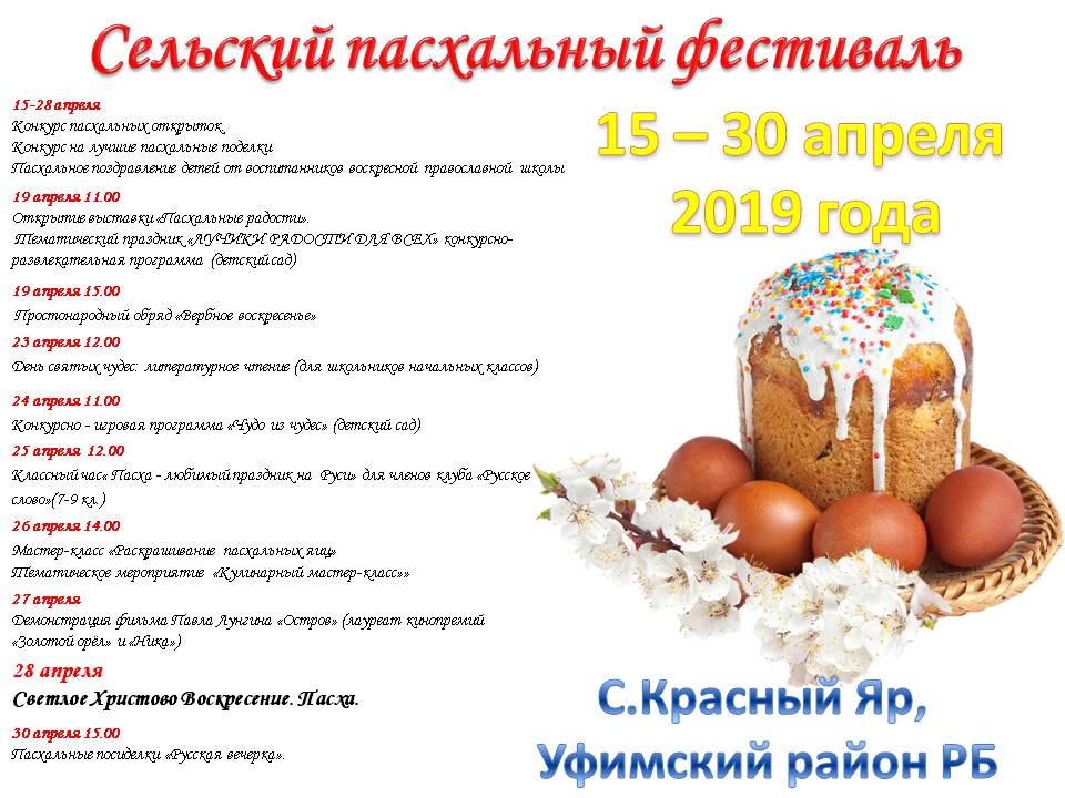 Завтра 19 апреля в ИКЦ русских «Красный Яр» в Уфимском районе в 11 часов состоится открытие выставки «Пасхальные радости», а в 15.00 – в СДК села Красный Яр откроется Простонародный обряд Вербное воскресенье.