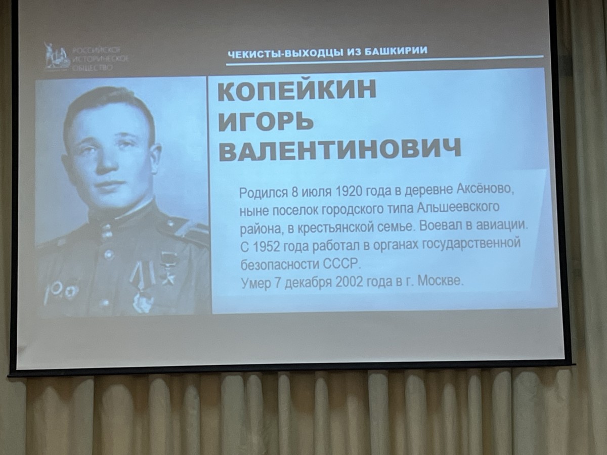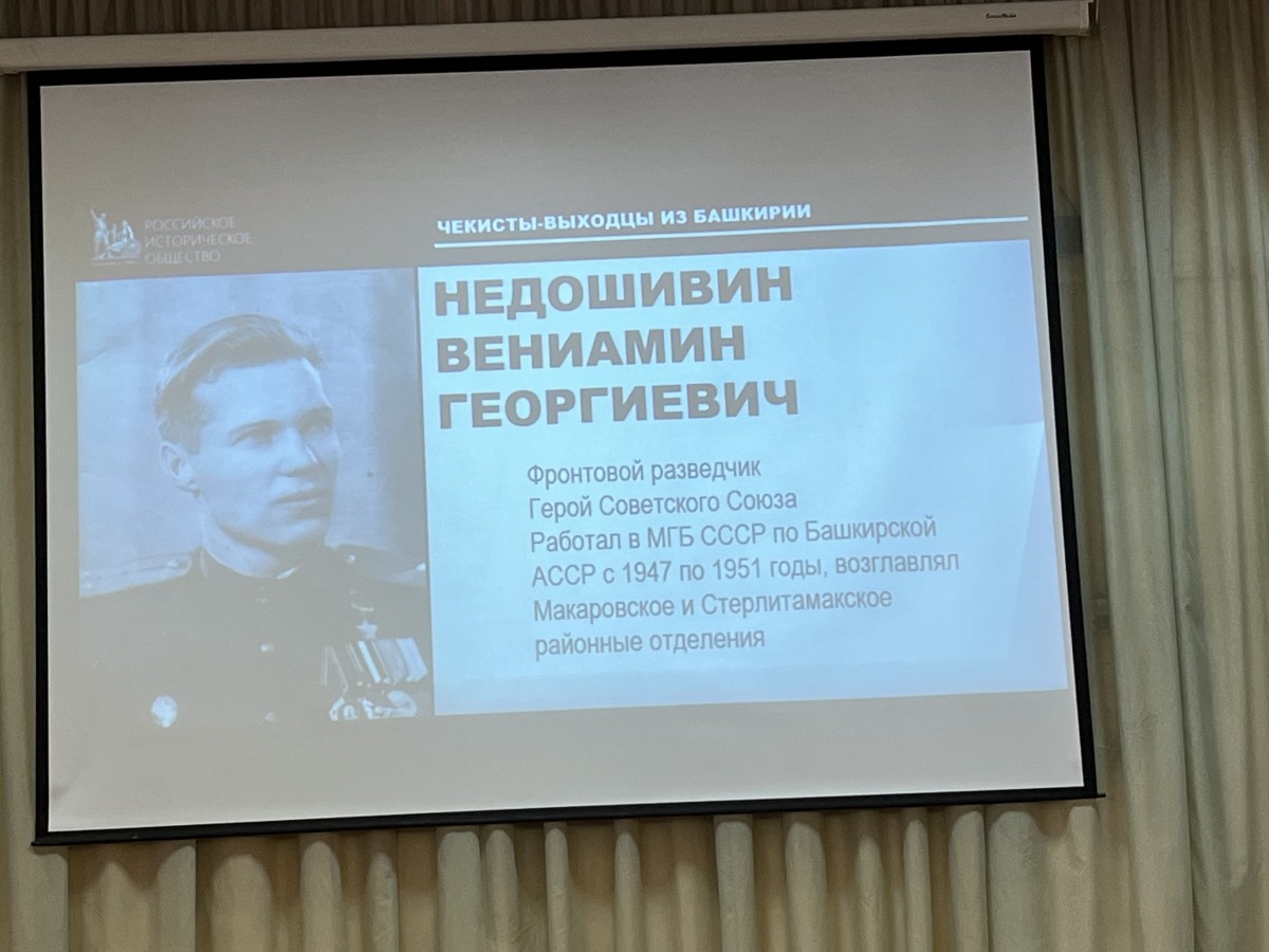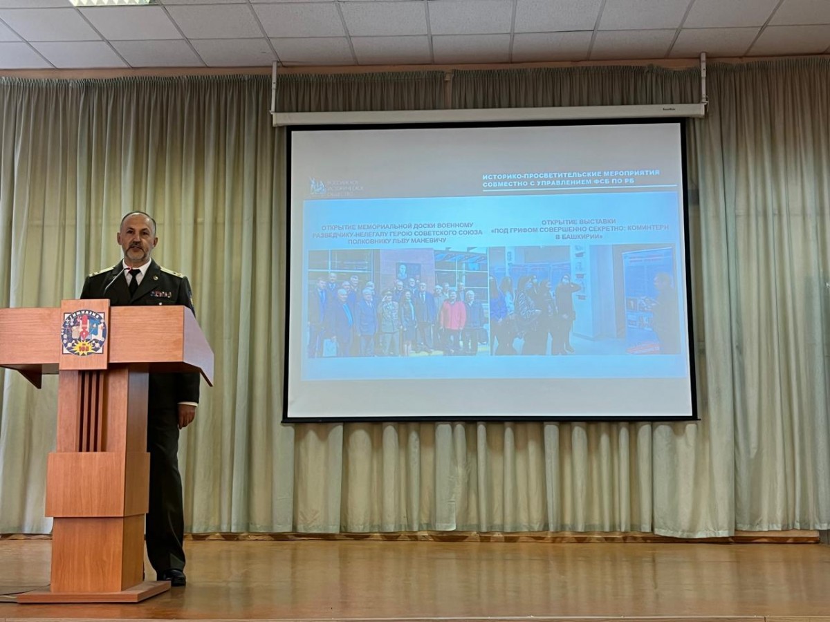 Председатель Совета отделения Российского исторического общества в Республике Башкортостан, директор Центра гуманитарных исследований Министерства культуры Республики Башкортостан, кандидат политических наук, полковник ФСБ в отставке - Марданов М.Х. рассказал ребятам о работе органов государственной безопасности в годы Великой Отечественной войны 1941-1945 гг. и о борьбе с бандитскими националистическими формированиями в послевоенное время.