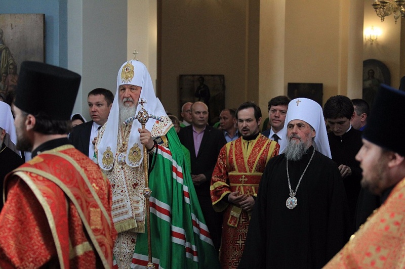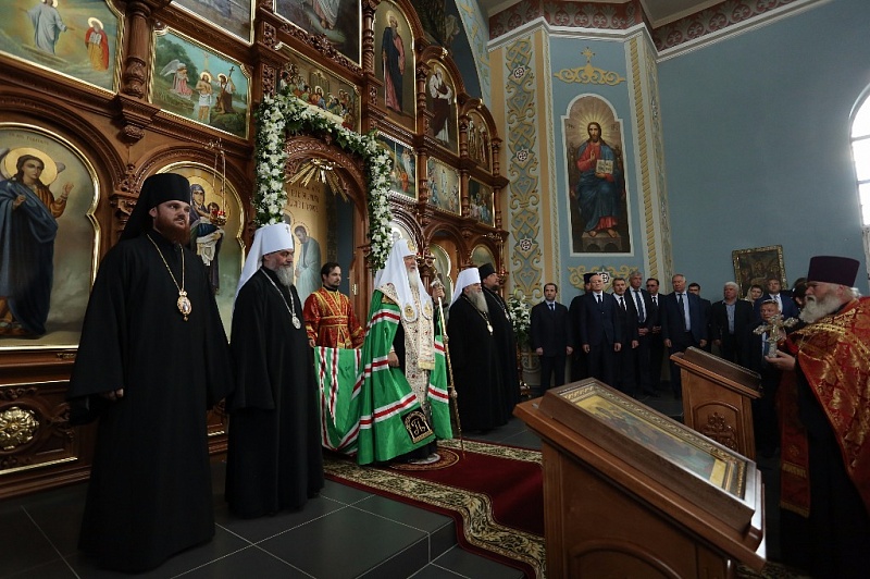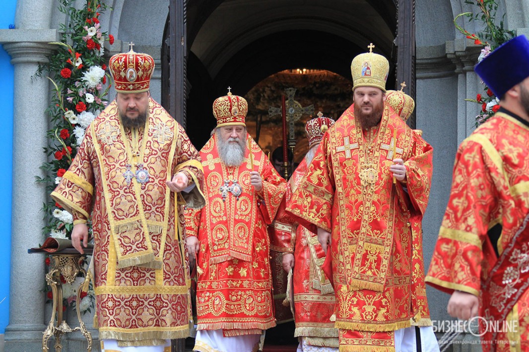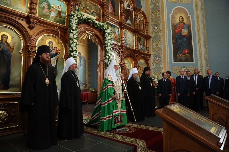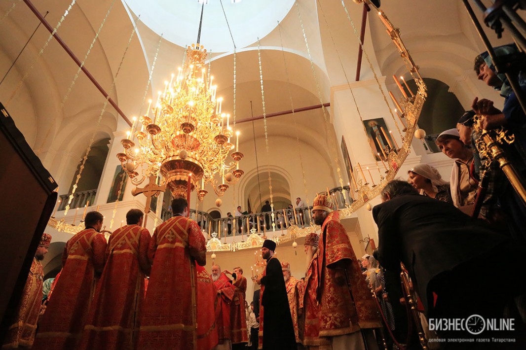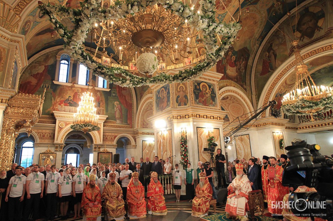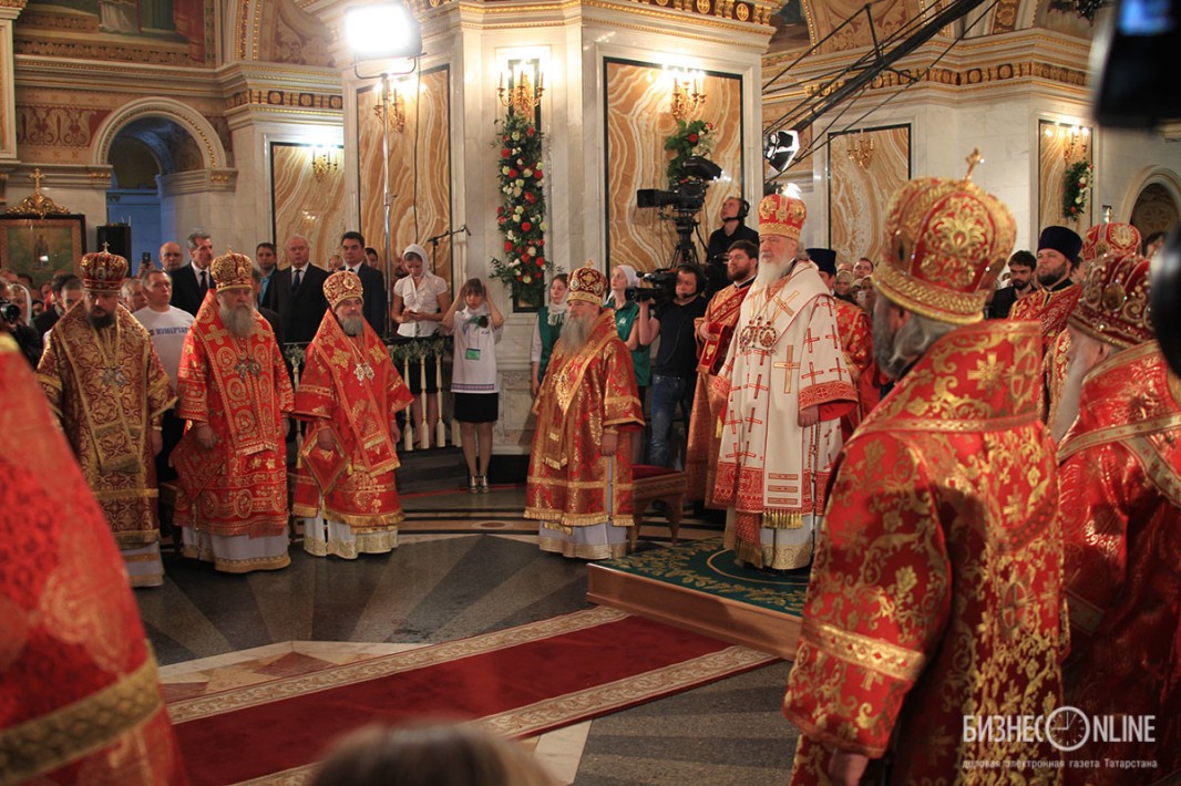Внутри храма главе РПЦ сослужило множество церковных иерархов — в их числе казанский митрополит Феофан, митрополит Санкт-Петербургский и Ладожский Варсонофий, митрополит Самарский и Сызранский Сергий, митрополит Уфимский и Стерлитамакский Никон, митрополит Оренбургский и Саракташский Вениамин, архиепископ Уральский и Актюбинский Антоний и др.