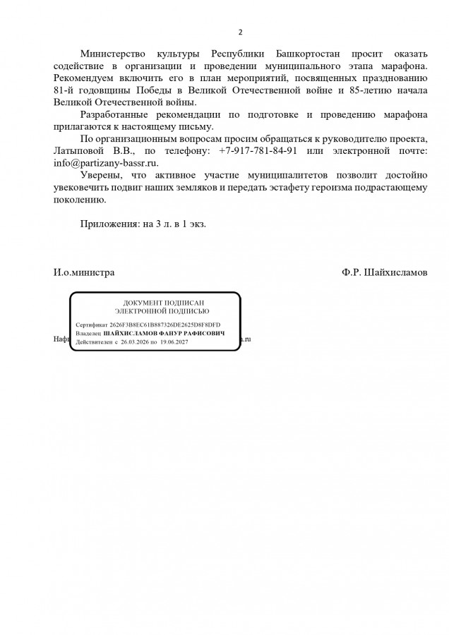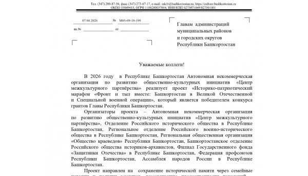 Министерство культуры Республики Башкортостан направило официальное обращение главам администраций муниципальных районов и городских округов с просьбой оказать содействие в организации и проведении Республиканского историко-патриотического марафона «Фронт и тыл вместе: Башкортостан в Великой Отечественной и Специальной военной операции».