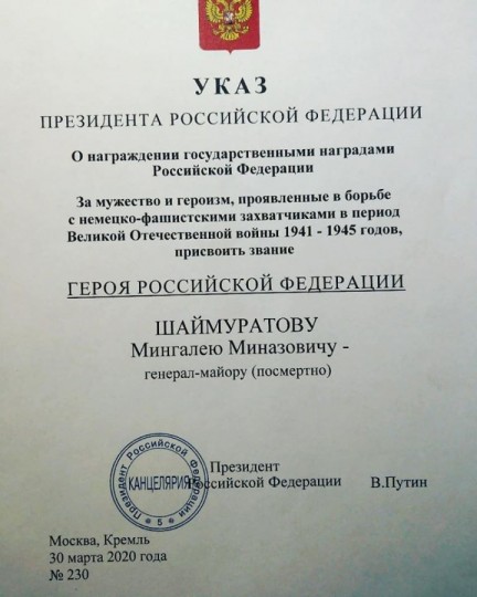 Владимир Путин присвоил звание Героя России посмертно легендарному командиру 112-й Башкирской кавалерийской дивизии времен Великой Отечественной войны генерал-майору Минигали Шаймуратову. В 2015 году с соответствующей инициативой выступило Российское военно-историческое общество.