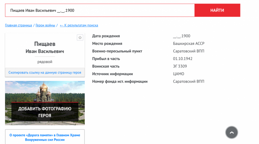 Пищаев Иван Васильевич 1900 года рождения, призван на военную службу осенью 1941 года. Воевал связистом, рядовым стрелковой дивизии. был участником боев за Сталинград, был ранен. В декабре 1942 года семья получила извещение, что Пищаев Иван Васильевич красноармеец 87 с/д «пропал без вести 20.12.1942 года Сталинградская область Ворошиловский район Антоново-Шестаковский с/с д.Антоновка».