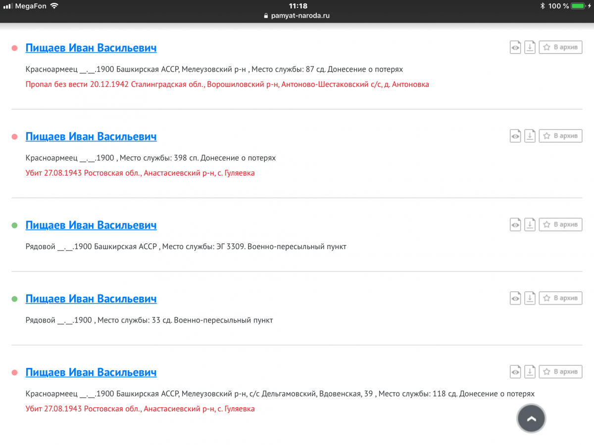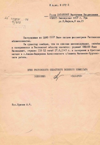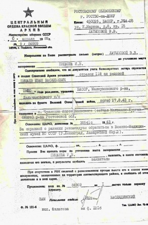 Семья - 6 детей проживали с тетей в с.Зирган Мелеузовского района (мать скончалась 7 января 1940 года от болезни). Позднее пришло известие, что Иван Васильевич ранен, контужен и находится в госпитале. После госпиталя Иван Васильевич вновь был направлен на фронт. Принимал участие в боевых действиях на территории Донецкой и Ростовской областей. Погиб красноармеец Пищаев Иван Васильевич 27.08.1943 года в с. Гуляевка Анастасиевского района Ростовской области. Семья долгие годы не знала о судьбе отца. Я направляла письма в разные инстанции, пытаясь получить хоть какие-то сведения о своём деде, написала и в Центральный архив Министерства обороны Советского Союза. И наконец 25 апреля 1990 года пришёл ответ из Ростовского областного военного комиссариата, что рядовой 118 с/д Пищаев Иван Васильевич погиб 27.08.1943 года и захоронен в братской могиле в с. Авило-Фёдоровка Алексеевского с/с Матвеево-Курганского района. в том же году в праздничные майские дни 1990 года мы со своей семьёй - родители, брат, мы с мужем и наши дети поехали на могилу к деду. Посетили братскую могилу, посадили там розы, устроили небольшие поминки с жителями села и раздачей памятных сувениров. Мы поблагодарили сельчан за заботу о могиле, память о воинах, в том числе и о Пищаеве Иване Васильевиче, выслушали их рассказы о тех страшных днях, когда кровь лилась рекой и всюду лежали трупы солдат. Жители окрестных сел в условиях ещё шедших боевых действий находили советских солдат и хоронили, где придётся - в полях, лесах, на своих огородах. После войны погибших защитников Отечества торжественно перезахоронили в братских могилах. Наш дед - Пищаев Иван Васильевич нашёл свой последний приют в с. Авило-Фёдоровка Алексеевского с/с Матвеево-Курганского района.