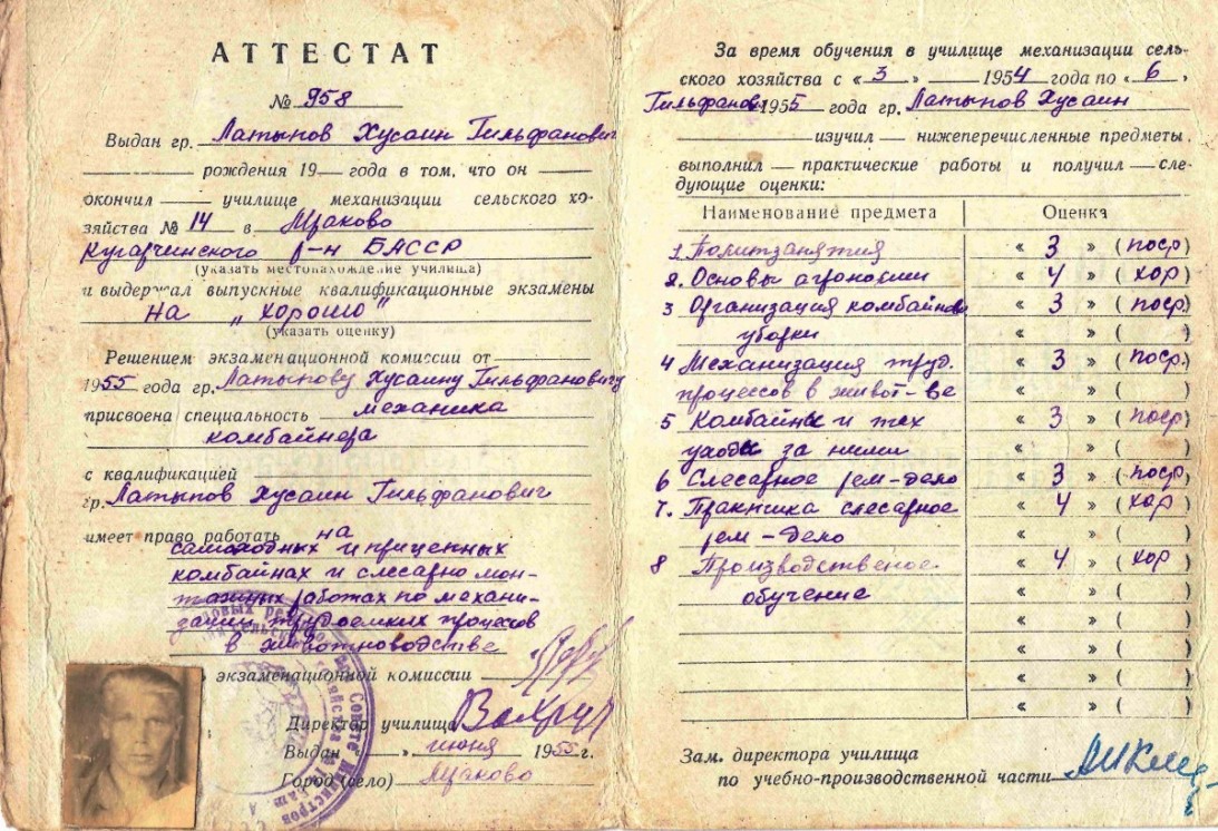 В 1955 году окончил Училище механизации N 14 в с. Мраково Кугарчинского района по специальности механик и комбайнер.