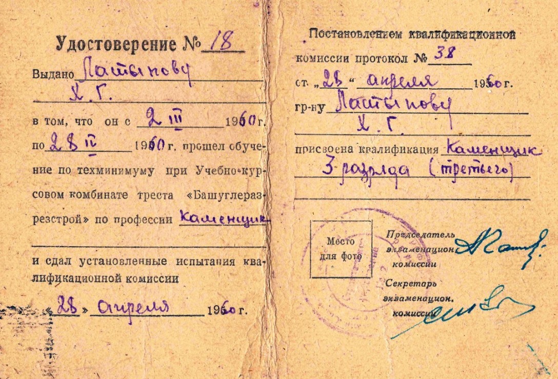 В 1960 году окончил техникум при Учебно-курсовом комбинате треста «Башуглеразведстрой» в г. Кумертау, получил профессию каменщик и с тех пор навсегда связал свою жизнь со строительной отраслью. Трудился в Нугушском специализированном управлении треста «Башуглеразведстрой» (позднее переименован в трест «Кумертаустрой»), в СУ-2 треста «Мелеузхимстрой», неоднократно становился победителем социалистического соревнования. Награждён многочисленными почетными грамотами и благодарностями. Воспитал троих прекрасных детей – сыновей Салавата и Шамиля и дочь Альфию.