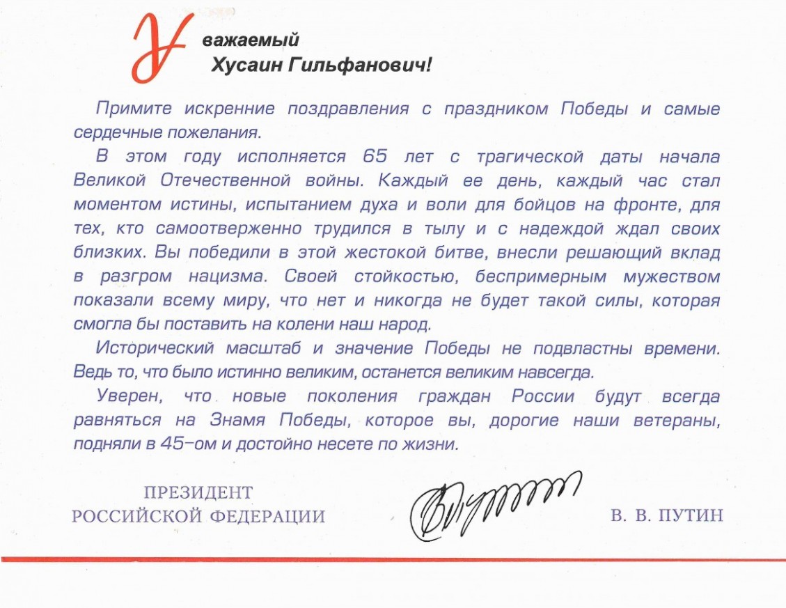 Латыпов Хусаин Гильфанович – 16.03.1927 года рождения, призван на военную службу осенью 1944 года, был очень скромным и никогда не говорил, что он участник Великой Отечественной войны. Проходил службу где то на Кавказе, был ранен, находился на лечении в госпитале. После войны вернулся домой в родной Кугарчинский район.